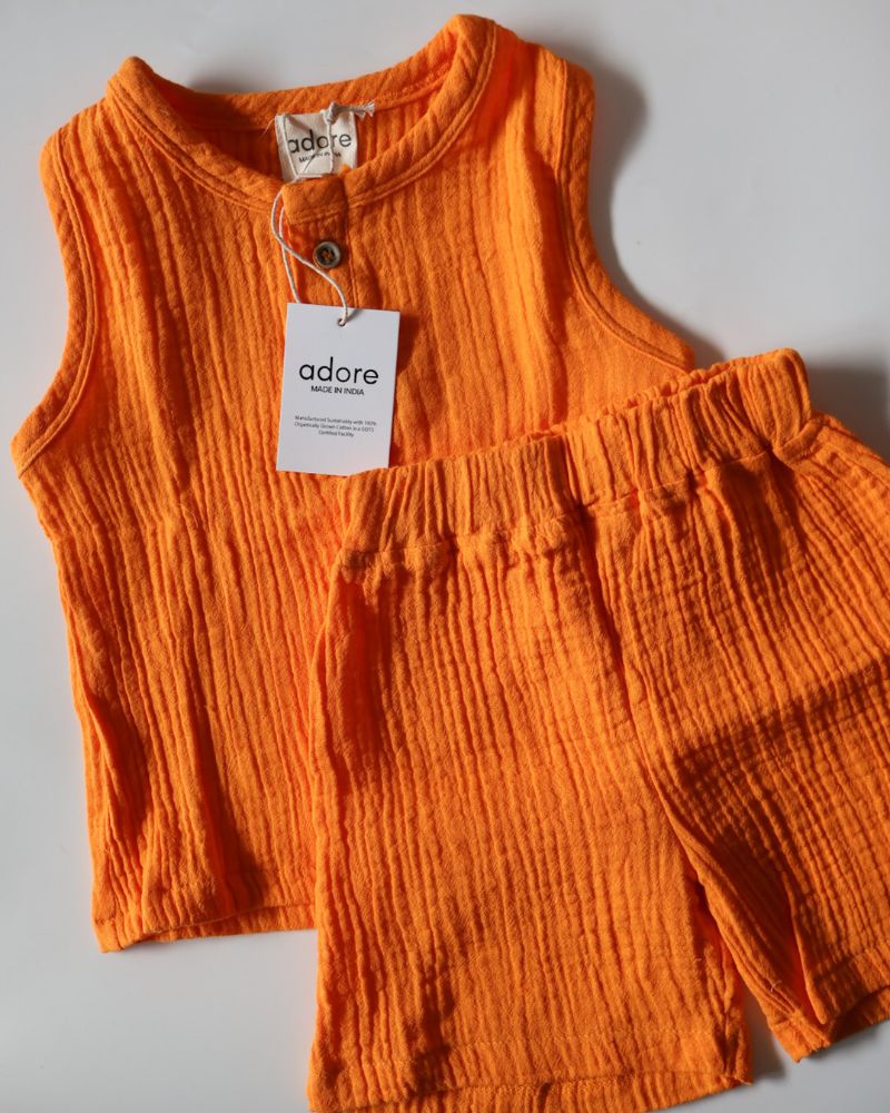 Keep your little one cool and comfy with our 100% Muslin Cotton T-Shirt & Shorts Set.