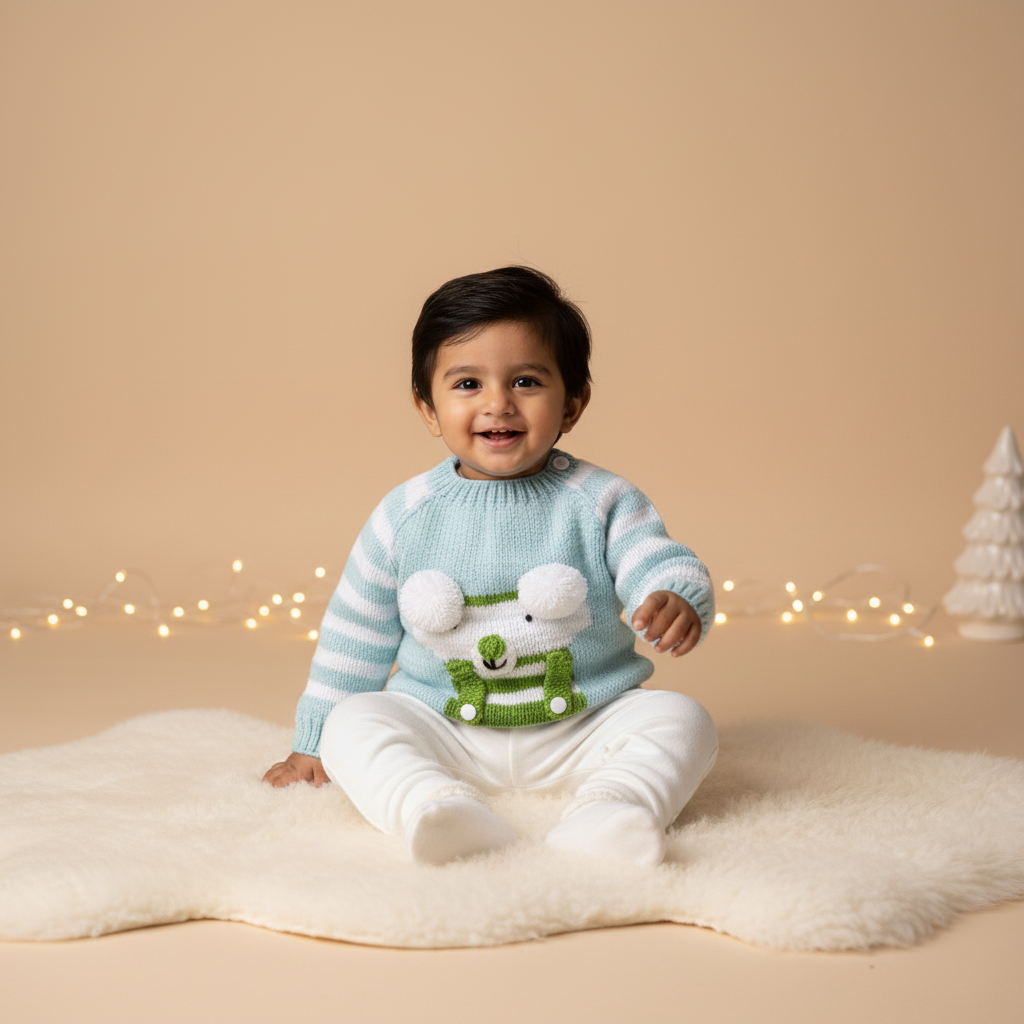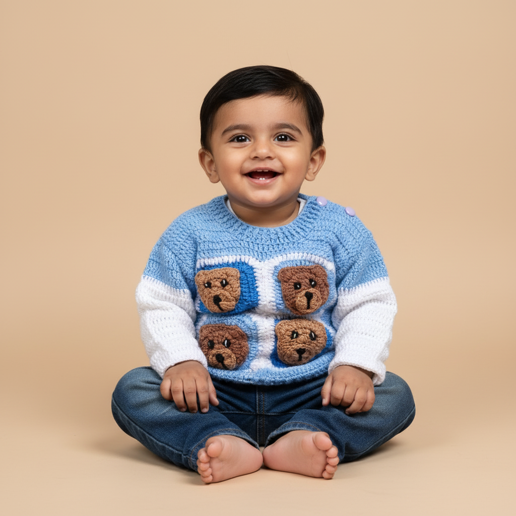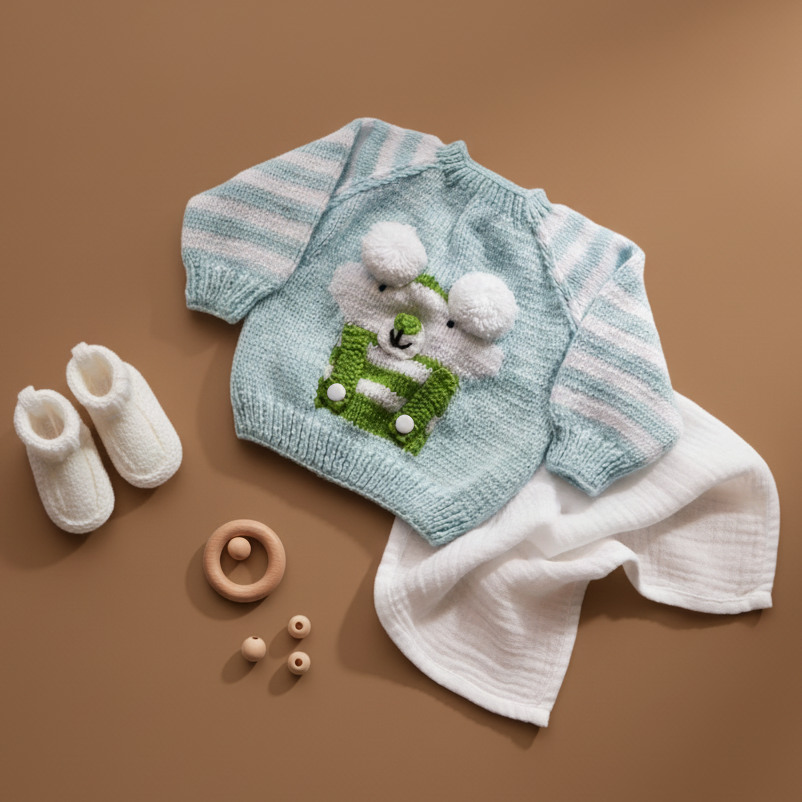 Wrap your little one in cozy warmth with our handmade baby sweaters, crafted from premium Ganga Acrylic yarn — Oeko-Tex certified for safety and softness. Designed to be gentle on delicate skin, these sweaters feature playful motifs and timeless patterns, perfect for everyday wear or gifting. Lightweight yet snug, they keep babies warm through every cuddle, giggle, and nap.